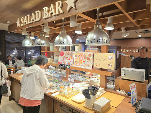 2023年1月24日、火曜日、午後7時頃、ふたりで、久しぶりに訪問。 今にも雪が舞ってきそうな寒い夜だったので、席は半分程空いており、好きな場所を選ぶことが出来たので、サラダバーの近くの席を選びました。 タッチパネル方式で注文するようになっていました。 私たちは、手元のメニュー表から、大葉おろしハンバーグ(醤油ソース)769円 と、チェダーチーズハンバーグ(デミグラスソース)769円 と、特製ガーリックバター&レモン 165円 と、カレー&健康サラダバーセット 599円 をふたつと、グラスワイン(白)220円 を注文しました。 カレー&健康サラダバーセットには、サラダバー、日替わりカレー、ライス、スープバー、パン、デザートと、サラダバーコーナーの全てが含まれています。 本日のカレーは、バターチキンカレーでしたが、定番カレーも復活と書いてあって、2種類のカレーソースが楽しめました。定番カレーは癖がなく食べやすくて人気があります。 パンは、自分でトースターで温めてから食べることができ、パンもマーガリンも美味しいです。 サラダバーには、5種類位のドレッシングやステーキソースが其々置いてあり、好みで小皿に乗せてきて、色々な味を楽しむことができます。 カレーライス、パン、スープ、サラダがあるので、育ち盛りのお子さんでも、お腹いっぱいになります。 ハンバーグ、ステーキは、まあまあですが、コストパフォーマンスを考えたら、評価値4は誰でもつけたくなると思います。 お店の入り口は、2階にあるので、階段に気をつけること、お手洗いの入り口にも段差があるので気をつけることを伝えれば、高齢の御家族がいる方でも、十分満足してもらうことができると思います。若い方には、ブロンコビリーの方が向いているかもしれませんが、こちらの方が、ハンバーグやステーキは、脂っぽくなく、適量で、高齢の家族に喜ばれた経験があります。 子どもの大好きなカレーライスも食べ放題だし、ファミリー向きの良いレストランだと思います。スタッフは、みなさん感じが良いです。