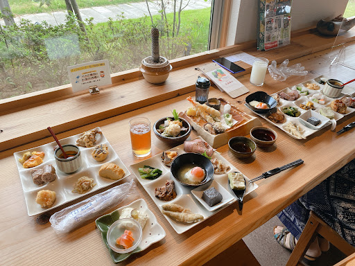抹茶豆腐、胡麻豆腐、温泉卵、うどん、 牛すじカレー、茶碗蒸し、卵焼き、天ぷら、 ひじきの煮物、切り干し大根の煮物、サラダ、 唐揚げ(2種)、ローストビーフ、いのしん豚、 おひたし、きゅうりの浅漬け、ウインナー、 サーモン、ナスの肉みそ、多種揚げ物、デザート、ドリンクなど。
