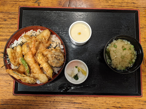 天丼とうどんのセットを頼みました。 天だれがつゆだくでびっくり!いつももっとタレほしいなーと思ってるのですがここはもう満足すぎでした✨ えびと野菜、この日はスナップエンドウかな?これがとても美味しかったです🤤 相方はなんか豪華ランチを頼んでいて小鉢も海鮮丼もお肉もちょっと貰いましたが美味しかったです。