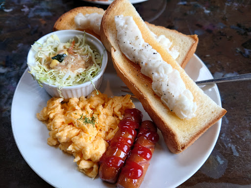 嫁と2人で、思案庭モーニングセット…ドリンク価格+¥300(ポテトトースト+スクランブルエッグ+ポークウインナー+サラダ)