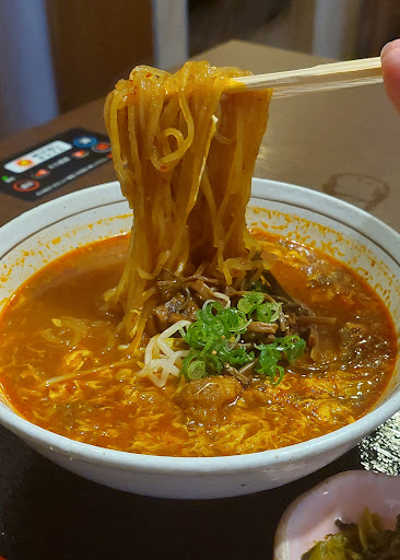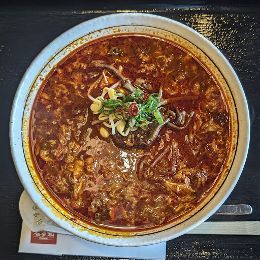 希夢知ラーメンは良いビジュアルですね~ 見た目は辛そうですが、ちゃんと韓国唐辛子を使っていて甘みと旨みがあって実はそんなに辛くないんです。私は韓国唐辛子ならいくら入れても大丈夫なんですが、この日はシェアなので我慢してノーマル(^^; 麺は一般的に韓国冷麺でお目にかかるツルツル・シコシコ・弾力性ある灰色麺。この麺はこのお店みたいに温麺でも使われるんですよね~ スープはカルビスープで肉の塊もゴロゴロ。 最後はスープにご飯を入れてカルビクッパでシメなきゃ勿体ないですよね!本当に美味しかった!