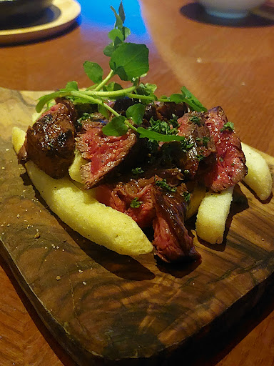 ハラミステーキは赤身のレア感がいい感じ。一番美味しい焼き加減です!肉汁溢れる絶品ステーキ! アヒージョも私好みの塩味強目な感じ。バゲットひたひた浸けでオイルもしっかり完食しました!