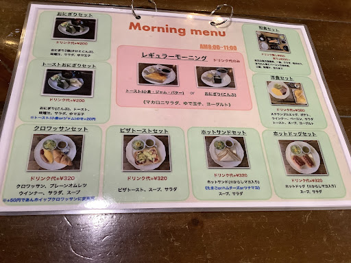 最近知った美味しいサンドウィッチの店、「にこ。」に向かうも 目の前でシャッターが閉まるという散々な結果。 テンションダダ下がりな帰り道、いつも混んでいるこの喫茶店に来店。 駐車場は混んでいますが一台も停めれないというのは本当に稀です。 回転が早いのでどこかしらに停められます。 店内はごく一般的な喫茶店。活気があります。 メニューを見ると結構選択の幅が大きいですね。 昼飯もハシゴに行くので軽くブレンドとトーストおにぎりセットをチョイス。