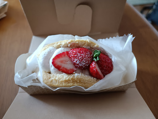 今回テイクアウトしたオムレットは生地がフワフワでクリームの甘さ控えめ、苺も酸味が少なくてジューシーなのでサッパリと食べれました。クリームの上だけ苺が乗ってるのかと思ったら中にも隠れていたのでクリームより苺の甘さが口の中に広がって意外とフルーティーです。 甘党さんには物足りなく感じるかもしれませんが、甘いのが苦手な方には丁度いい甘さなのかなと思います。