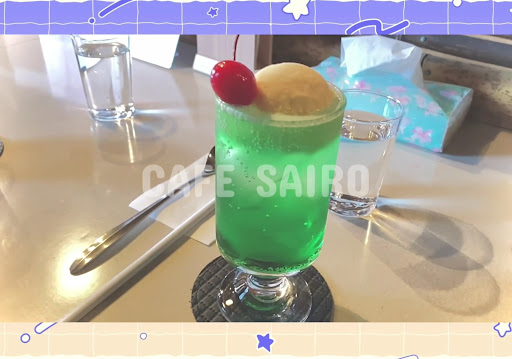 駐車場は店舗前に2台。朝倉川堤防も停められる。 喫茶利用。 クリームソーダ カフェインレスアイスコーヒー