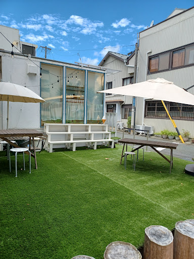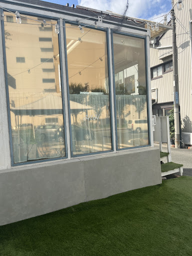 北側の東進方向の一方通行に面したこぢんまりとした販売所コンテナ 販売所の東側が人工芝が敷設されたオープンテラスになっていて そこから南隣に2階建ての室内イートインスペースがあります イートインスペースは2階部分(一階はトイレなど)机が3つほど、国道259号線方向の壁側にカウンターが6席ほど カウンター席は目の前が窓であり、ちょうど路面電車が通るのが見えるため、豊橋市民には面白くないかもしれませんが、他地方の方には中々興味深い景色が見ながらの休憩が出来ますので、かなりオススメです