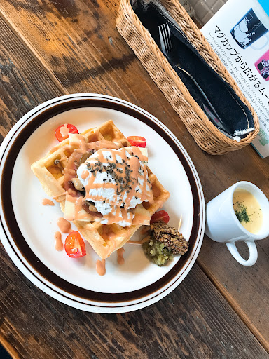 Read more14時すぎにおじゃましました。 あまりお腹がすいていなかったのでポーチドエッグがのったワッフルを注文。 税込で660円。コーンスープ付き。