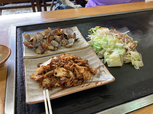 昔ながら感のあるお店で お好み焼き(ソース)とお好みねぎ焼き(しょうゆ)とありました。 ランチお得ですが、違った味が食べたかったので単品食いです。 豚キムチとアサリのバター焼き、お店オススメの野菜たっぷり豆腐焼き、お好み焼き(いか)、お好みねぎ焼き(えび) お好み焼きはしっかり焼いてくれているのでテーブル席の鉄板で食べているうちに固くなってきますが、それはそれで美味しかったです。 塗ってあるのが辛子マヨネーズなので苦手な人は気を付けた方が良いかも。 お好みねぎ焼きは横から見ても葱たっぷりでした。 豆腐焼きには一味か七味が入ったポン酢を別皿でくれます。お好み焼きの合間に食べると口の中がスッキリして更に美味しかったです。 豚キムチ、野菜が多いかと思いきや結構お肉がありました。とっても美味しかったです。 アサリは砂抜きが甘いかなって物がちらほらありましたが、味はとても良かったです。酒蒸しと迷ったけどあまり見かけないバター焼きにして良かった。