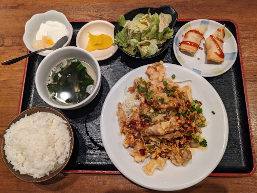 油淋鶏定食(辛口)は、山盛りの油淋鶏に、ご飯、ワカメのスープと続き、春巻き、サラダ、たくあん、デザートの杏仁豆腐が付いてくる定食でした。
