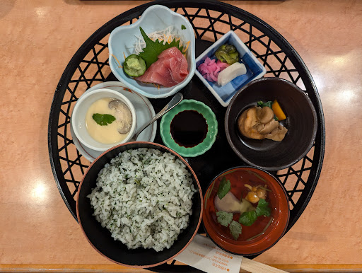 菜飯(大盛)は、細かく刻んだ大根菜を、軽く塩で味付けして、炊き上がったご飯に混ぜ込んであり、ほのかな塩気とシャキシャキとした食感が楽しめ、見た目の色合いがよく、蒸された大根菜の香りもよく、とっても素朴な味わいだと思いました。