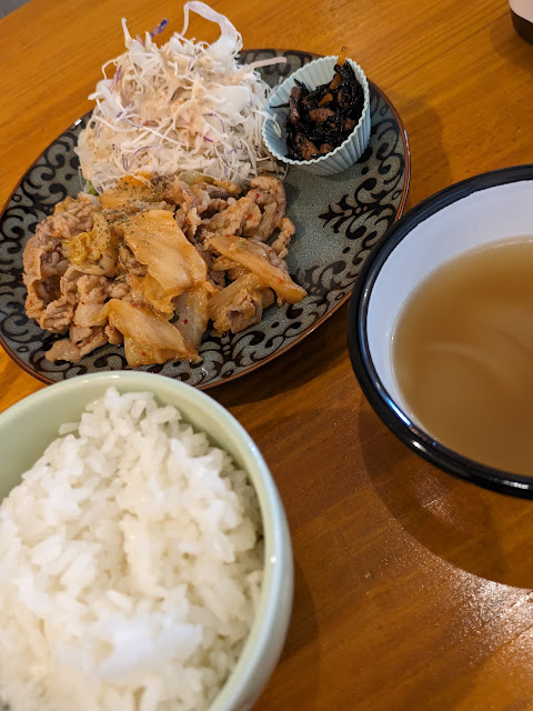 お料理到着、何が出てくるのか聞いていなかったのだが、ご飯にコンソメスープ、メインの豚キムチにサラダと小鉢はひじき。 これで600円! 物価高のご時世、もうちょっと貰っても良いと思った。 価格改定は難しいかもしれないが。 申し訳無いので、ドリンク追加。 ランチドリンクは150円、安い。