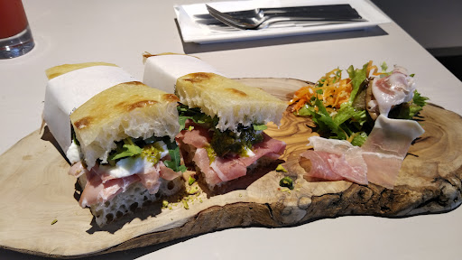 サンドイッチメニューは、生ハム、サラミ、ソーセージから選べ、トッピングとしてモッツァレラとピスタチオのソースをつけることもできます。 そして、そのサンドイッチに生ハムとお惣菜をプラスしたプレートに変更もできるとのこと。 奥様が優しく解説してくれるので何とか理解できました笑