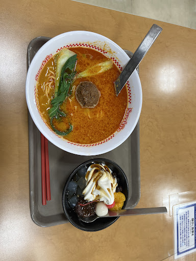 愛知県豊橋市のアピタ向山店の2階にある、スイーツなども少し扱っているラーメン屋さんです。名古屋をはじめ、東は静岡県から西は兵庫県まで広きにわたってチェーン展開されているお店のうちの一つです。フードコートにあるので独立した空間ではありません。フロアにいくつか手指消毒用のスプレーボトルがあります。注文は口頭で、今回注文したのは香る金ごま担々麺とあんみつです。レジで支払いを済ませると呼び出し用のブザー端末を渡されます。あとで品物を受け取って席に着いて食べます。テーブルにはアクリル製?の板が立てられています。某アニメにも出てきたスプーンともフォークともつかない物も付いてきますが、自分は苦手なので箸を使います。味、量はそこそこです。基本、リーズナブルな価格設定なので味...
