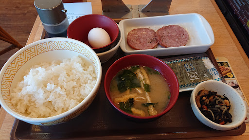 土曜日午前8:00過ぎ訪問。お客は2~3組程。店員さんはワンオペ?かと思うくらい少なく忙しそうでした。勝手に座ってタブレットでソーセージたまかけ朝食を卵を温玉に変更して(410円)注文。水は後でもらいました。注文してから料理が来るのは早かった。 普通に美味しい朝食で、...