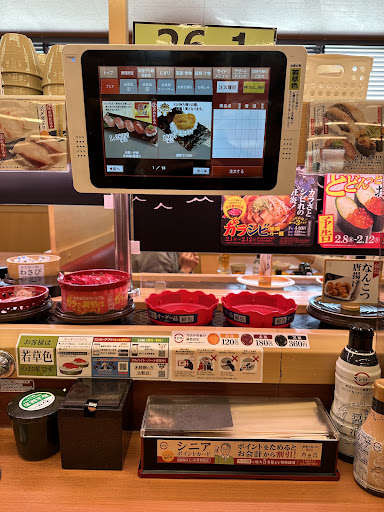 愛知県豊橋市、国道1号西口町信号交差点を南東にしばらく進んだところにある回転寿司のお店です。できてから結構経っていて建物内外年季入ってます。フロアはそこそこ広く、カウンター席やテーブル席があります。入口入って程なくスタッフに人数や希望する席を訊かれるので、今回カウンター席を選んで席に着きます。注文はそれぞれの席に設置されたタッチパネル式の端末を操作して行います。今回注文したのは期間限定物を中心に寿司やラーメン、デザートにパフェです。お茶は粉末、湯呑みはレーンの上の方にあります。割と早い時間でしたのでお客さんは少なめでした。基本的に稼働しているレーン上には品物は流れていません。注文した品物はそれぞれの席に割り振られた色が記載されたトレイにのせられてきます。某店の様に注文主の席の前で止まったりはしません。食べている間にお客さんが増えてきたせいか、品物の到着まで待つ時間が長くなっていきました。今回注文したあったかい系のラーメンは少しぬるめでした。タッチパネル端末のスピーカーが品物の到着を知らせてくれるのですが、やや古いこともあってかお世辞にも音がいいとは言えません。設備が更新される時にはいい声、いいイントネーションによる案内があるといいと思います。食べ終わった後タッチパネル端末を操作してスタッフを呼び、会計用の札を受け取ってレジに行きます。各種決済方法に対応していますが、詳しいことは要確認です。駐車場は広いです。駐輪場につ...