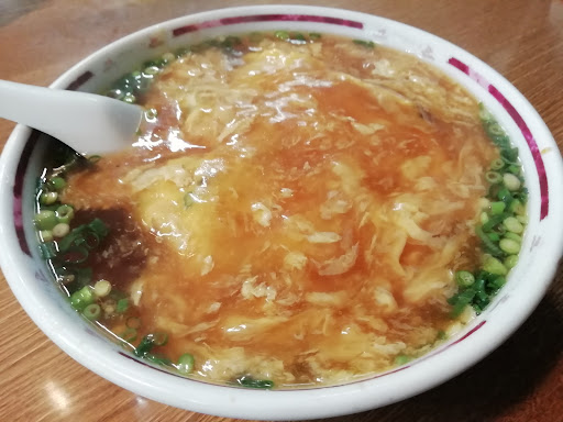 中華スープは、天津飯と一緒に付いて、ワカメ、ネギ、錦糸玉子の入ったスープは、塩気が控え目で、サッパリした味わいの中にコクがあり、天津飯と交互に飲むと、丁度いい味でした。