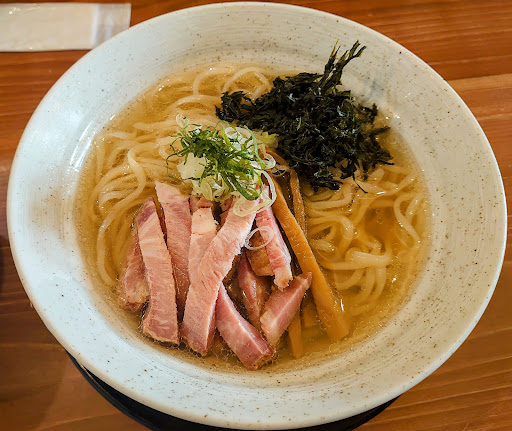 Read more初めて来店、味玉塩ラーメンを注文。 先客は7名程度で直ぐに着席出来た。 7名中6名は着丼出来ており、ラーメン待ち1名、私含め2名もラーメン待ち、着丼までは10分以上待ちました。 いざ着丼、盛付けは綺麗で美味しそうなビジュアルと出汁の香り、早速スープをレンゲで一口、味が薄い。 次に麺をすすると平打ち縮れ麺で良い感触。 しかし出汁が薄いので麺に味が絡まない。 麺は自家製なのか合格点なのに出汁スープとのバランスが合っていない。 結論は出汁スープと麺を別々に食べている感覚。 麺に出汁スープが絡まないので麺とスープの一体感は無かった。 麺がおいしいだけにとても残念。 実食中に後から来店のお客様が8名程度行列、店内に4席の空席があったが、一人客も案内されていなかった。 今日見た限りお客様の回転は遅めだと思う。 いつも店外の行列が人気さを物語っているが、大切なのは人気でお客様の回転が上回る事、もともと回転が遅く行列になるパターンもあるので、皆様今後の各飲食店の物差しにしてほしい。 接客は丁寧だが女性の声が小さくてハッキリしない、また従業員全体的に声が小さくハキが無かった。 元気やハキはラーメンの味に直結しないが、総合的印象や今後のリピート率に繋がると思います。
