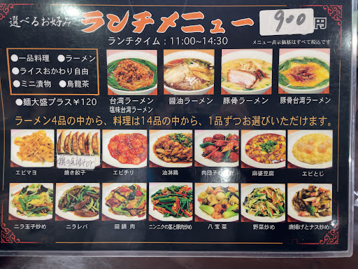 Read moreランチに。店舗前で道路工事してますが営業してました。駐車場は交差点手前から入れます。歩きで来る人が多かったですが🤭選べるランチ¥900でエビマヨ+台湾ラーメンをチョイス。エビマヨがなかなか美味かった👍プリプリのエビが五匹、マヨソースがちょっと辛み(一味か?)があってご飯が進む。台湾ラーメンはスープがちょっと薄く感じたが卓上調味料に醤油があるのでちょっと足したらいい感じに(個人的な意見です)千円切ってて内容は満足です✌️油淋鶏がなかなか大きかったので次はそっちかな...