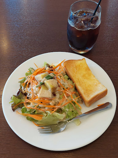 モーニングはレギュラー一択のみ。 でも、ドリンク代420円だけの値段でこのモーニングは嬉しすぎる! とにかくサラダが盛りだくさん!レタス、人参、キャベツなどに加え、さつまいもも乗っていて大満足! ハーフ食パンの大きさ比較で見ていただけると、サラダがどれほど沢山入っているか分かりやすいかも(^-^)