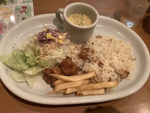 Read more平日の夜、突如喫茶店飯が食べたくなり来店。 分煙されていますが禁煙席と喫煙席の端同士は隣接しておりあまり意味がありません。 メニューを見た第一印象…高い!この値段だったらドリンク付いて然るべきだと思います。 席に着いてしまったので適当にチキンピラフレギュラーサイズを注文しました。