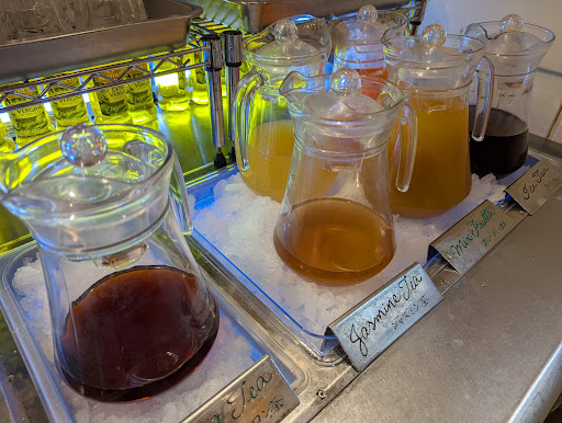 フリードリンクは、ソフトドリンクにウーロン茶、ジャスミン茶、フルーツミックス、アイスティー、アップル、野菜ジュースから選べて、温かい飲み物は、コーヒーや紅茶があって、紅茶は、ティーアースの茶葉を使っており、種類も豊富で、様々な味を楽しめるのがイイと思いました。
