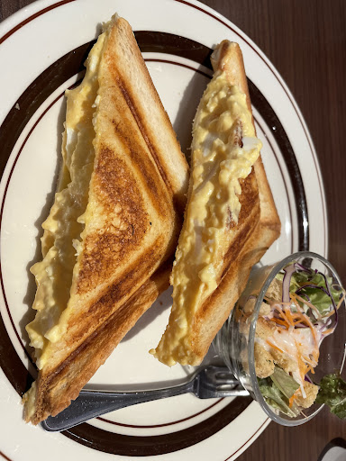 【1.2.3枚目】玉子ホットサンド サンドイッチの中の玉子が溢れ出てきました😳✨ それぐらいボリュームたっぷりすぎて、大満足です💮 サンドイッチの外側のパンはカリッとしていて、サクサクでした。 中の玉子はフワッフワだから、めっちゃ相性が良かったです☺️ 玉子は溢れ出るぐらい多いけど、サンドイッチの下側はピタッと留まってあって下から玉子はこぼれてきません🐰