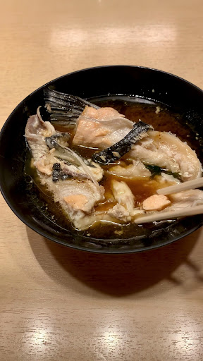 魚の赤だし🐟 魚のアラで作った赤だしです🐟 アラがたっぷりで身も柔くてゼラチン状のプルプルした部分も多くて美味しかった🐟 お出汁は見た目より味は濃くなくてより一層アラの美味しさが際立っていました🐟 わかめと麩が入っているのも美味しかったです✨
