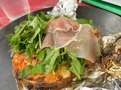 トマトソースとチーズたっぷりの焼きたてベース生地に、たっぷりの葉物野菜と生ハムを後乗せして、オリーブオイルを回しかけて頂きます。
