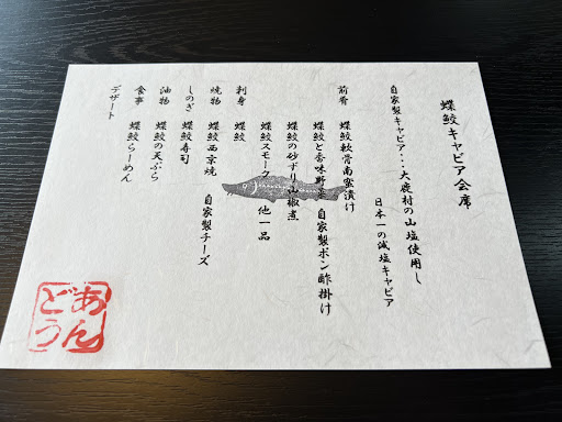 Read more蝶鮫コースが食べられると聞いてこちらへ。予約必須です。お料理は蝶鮫、山菜、松茸が一年中食べられるそうです✨すごい!✨ 店主さんと奥様のお話を聞きながらお料理をいただいたのですが、店主さんの蝶鮫飼育や山に食材を採りに行くお話が興味深すぎて👀✨キャビアも山菜もこんなに食べられるなんて幸せ過ぎました🤤お店の場所も素敵です🏔️近くに道の駅マルシェがあり、こちらのキャビアや松茸チーズなどの販売もありました!楽しい食事時間をあ...