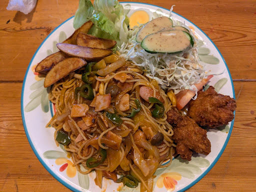 メニューの種類が多く、和洋カレー何でもある中、ワンプレートFセットを注文。 フライドライスと唐揚げとフライドポテトとサラダのセットで、 唐揚げはパリパリ、フライドポテトはサイズが大きくてアツアツ。 フライドライスは、食べたことのない味で、具はウインナー、海老、卵、玉ねぎなどが入っていた。七味ではないけど香辛料が入っている、アジア系のピリ辛ピラフみたいな感じ。 価格は1,100円、結構量が多いのでお腹を...