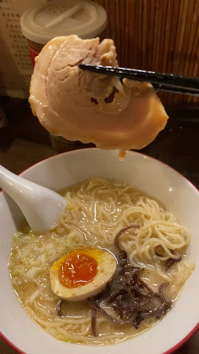 Read more2025年4月初利用 あきば家らーめん715円+半熟味玉110円+おでん3点(餅巾着 こんにゃく 牛すじ)385円 ←税込価格 平日雨降りの22時利用のためか貸切状態 よそのカンバン時刻以降や週末なら賑わうのかな 落ち着いた感じの大将殿に迎えられて着席 いくつかお訊ねして丁寧に説明を受け ラーメンは対面注文 セルフでおでんよそって値段を教わって ラーメン配膳待ちます おでんは気分がやわらぐ味つけ 比較的甘口な出汁かげん 女性受けしそう カラシが見当たらなかったが訊ねそこねた ラーメンはいま風ではないけど上品ビジュ 味玉は丸のまま2つに縦切りされている◎ 表層オイルが多少威張ってるかな? しかし 思ったより複雑重層なスープ! 勘違いだろうけど貝出汁の風味がする 美味いです 表層オイルのおかげ?でスープをよく拾うから 手繰りやすいチュルチュル麺は 食べあぐねることがない ブツ撮りしながらゆっくり食事でしたが 多加水よく茹でのため最後まで変化が緩や...