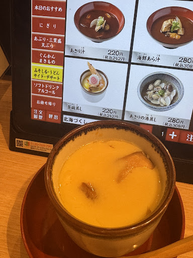 Read moreチェーン店ではない、回らない回転寿司。 回転寿司と大きく看板に書いてましたが、廻らずに提供がレーンで来るお店でした。 ランチ等がありましたが、普通に寿司注文で、色々たのんでみましたが、お味噌汁がセルフ無料なのを知らず、アサリ汁を注文したところ、デカい器にアサリ10個が入っておりました。 無料の説明が何処にもなく、店員さんからも知らされなかったのが残念。 メニューに、納豆巻きの天ぷらという、不思議なものがあったので、試しに注文したのですが、天ぷらで熱くなった納豆巻が届きました。 うーん、シャリが熱いのは食べ慣れないせいか、微妙な味でした。 あまり広くない店舗で、他の店と比べても騒がしくないのが...