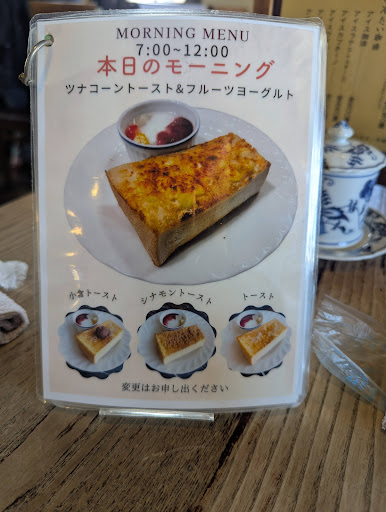 Read moreモーニングで行きました。 ドリンク代のみでツナコーントースト(1/2枚)とヨーグルト(フルーツ入)が付いてきました。 私はアイスコーヒー(450円)を注文、コップやお皿などお店のネーミング入りでオリジナルの陶器製品、色々と力を入れているな、という印象。 トーストのツナとコーンは、ささやかな気持ち程度に盛られているだけで寂しい感じでしたが、パンじたいはふんわりとしていてすこぶる美味しかったです。 店内は珈琲店によくありがちな、木目調でレトロ感を出したシックな装いで、BGMもクラシック、朝から落ち着きムード満点で嬉しみ。 店員さんは皆さん愛想が良く、またお店の雰囲気に合わせてお静かになさっていらっしゃいます。 常連客と思わしきご老体の方々が大声で話をしていたり、あるいは皆さん店員さんにぺちゃくちゃと話しかけられていて、それを聞かされているだけで落ち着き気分が半減なのは残念でした。 駐車場はそ...