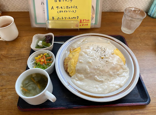 Read more田んぼと配送センター街にポツンとあるオムライスとパスタのお店。店内、壁紙等汚れが著しい。ランチは700円、大盛800円。ツナとソーセージの和風オムライスを注文。サラダ、スープ、フルーツとオムライス。コスパは素晴らしくよい!スープは具が多くて美味しいが、塩気が強すぎて残念。オムライスは、ツナとソーセージのチャーハンみたいなのはその単体で美味しい。でも塩気が強いかな。これにデミグラスが合うのか微妙だけど、そこそこ美味しかったです。トラック関連会社の方々相手だと、塩気が強い方が好まれるかもですね。安いし、オムライスまた食べたいし、アレだけど、お店の汚れがやっぱり気にな...