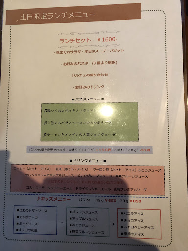 休日のランチをいただきましたが、かなり満足度が低かったです。 少量のサラダ、カップのスープ、バゲットスライス2枚、パスタ、ドルチェ、飲み物で1,600円。