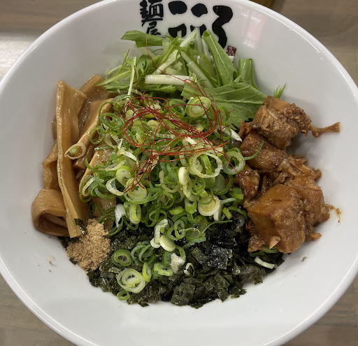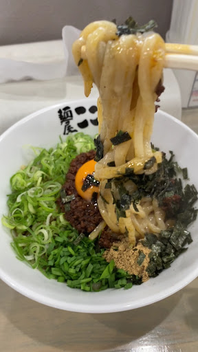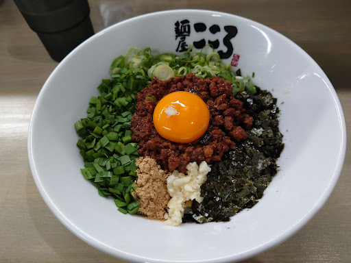 昨日、お昼は麺屋こころさんにお邪魔しました。このお店も券売機での購入となります。入ってすぐ左手に券売機があるのでそこで食べたいもののチケットを購入します。今回は後ろに人はいなかったので、じっくりメニューを見る事が出来ました。基本まぜそばのお店なのでまぜそばがメインなのですが塩ラーメンや台湾ラーメンも選べるようです。今回は初訪問なので、お店の看板メニューになっているノーマルの台湾まぜそばのチケットを購入しました。 店内はカウンター席が8席と4人がけのテーブルがあります。後は席が空くまでは店内で待つスタイルですね。真夏に外で待つことを考えると店内で待てるのは有難いですね。お店に入った時は待ち客が2人いた状態でした。待ってるとチケットを店員さんが取りに来ました。その時にニンニクは?と聞かれるので私はなしでと答えましたが、好きな人はニンニク入れてもいいかもですね。待つ事15分、席ついて10分程でまぜそば出てきました。ここまでで、25分です。食べ終わる時間が15分くらいとすると、40分の時間を費やす事になります。待ち人が多いとその分食べる時間が遅くなっていくので、貴重なリーマンの1時間の休憩だと移動とかも考えると結構厳しいかもですね😅。後、お店には時計ないので時計を気にして食べたい時はいちいち個人の時計を見る事になるので、煩わしいですから、壁掛け時計は欲しいとこですよね。お店の人も時計ないと困らないのかな?🤔と思ってしまいます。あるなら見えるとこに掛けて欲しいですね😅。 さて、出されたまぜそばですが、見た目はキレイで丁寧に作られてる感じがします。麺は太麺で、上に乗ってる具は海苔、ネギ、ニラ、卵黄、魚粉、肉味噌?肉そぼろ?が乗ってます。それらをワチャワチャと混ぜていただきます。 麺は弾力があり、具とよく混ざり濃厚で美味しいですね😄👍。台湾まぜそばなので辛味がありますが、辛い物好きな私的にはたいした辛さではなかったですね。食べながら周りを見ると、追い飯が出来るとの事。麺の大盛りにはしてなかったので、追い飯を頼む事に😄。追い飯は無料です。これは有難いですね😁。 追い飯を頼むと、自分の食べたまぜそばの器を持っていかれます。炊飯ジャーの蓋を開けおもむろにしゃもじでご飯をすくいダイレクトで私の食べたまぜそばの器に入れていきます😳。しかも軽く押さえてるように見えます。これにはびっくり。てっきり追い飯は茶碗でくれるものだと思ってただけに、ダイレクトで入れるのは想像してませんでした😳。他の人の時もそうやってるんでしょうか?!🤔。うっかりしゃもじにまぜそばのタレが付くことはないのだろうか?と気になってしまいました😅。洗い物増えてしまうかもしれませんが、出来れば茶碗に入れて欲しいですね。後、追い飯して食べてみましたが、麺のが美味しかったかも。これなら、最初から大盛りにしとけば良かったかな🤔。 メニューの写真に塩ラーメンだけ全く違うラーメンとしてあるのですごい気になります。塩は誤魔化しききませんから、そのお店のレベルが分かりますからね。機会あればまた来たいと思います。次は塩ラーメンか?!😁...