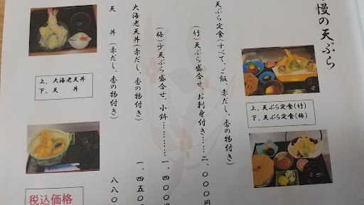 注文後に、奥から聞こえてくる天ぷらを揚げる音がジュ―ジュ―して食欲をそそる。 しばらく待って出てきた食事は、天ぷら(海老2本、キス、イカ、茄子、サツマイモ、大葉他)にマグロの刺身。