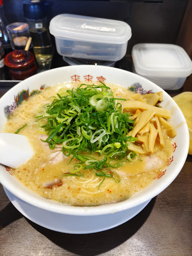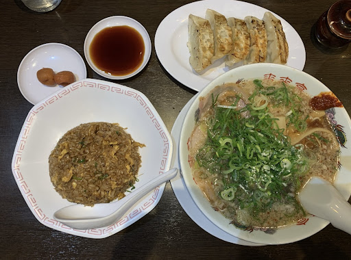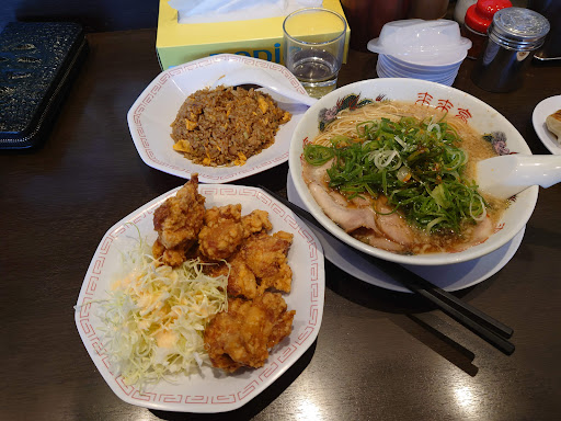 濃厚な鶏がらスープに背脂がいっぱい浮いているラーメンです。ラーメンの硬さを選べたり、ネギを多めにしたり、にんにくの量調節などできるのでありがたいです。 またテーブルの上にはコショーの他に、コチュジャン的な調味料も置いてあるので、味変を楽しむこともできます。梅干しも食べ放題です(が、食べ過ぎると塩分摂取量が上がりすぎるので要注意です) ガッツリA定食にしたのですが、ラーメンに半チャーハン、餃子(5個)が付いてきます。 チャーハンは醤油の味がだいぶ濃くて醤油メシみたいな印象、旨味みたいのは一切無かったです。焼き加減のパラパラ感はもっと欲しかったです。その方がラーメンと合います。チャーハンの味の濃さのせいで、ラーメンの味が損なわれ、ラーメンを半分くらい食べたらもう飽きてしまいました。餃子は普通でした。 カウンター席のテーブルは狭くて、料理を並べるとだいぶ窮屈で、さらに隣の席の人と普通にぶつかってしまいそうなくらいの距離、黙々と急いで食べないといけない空気感でした。 それと、テーブルの上の調味料の容器や、梅干しを取る小さいトングなどを、客入れ替えごとにきちんと消毒などされていないようなので、なんだか気になって仕方ありませんでした。 ただ、店員さんが皆さん元気が良くて、気分が良かったです。その分落ち着かない…というのもあるのですが笑。食べ終えたら直ぐに帰らないといけないような雰囲気で、店員さんがあからさまにレジ&テーブル片付け待ちをされていました。ので、やっぱりちょっと落ち着かないですね。 駐車場は店裏にも...