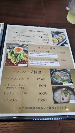 Read more以前来た時は韓国食材屋だけでしたが久しぶりに来てみたらお店の隣りに韓国料理がオープンしていました! メニューはいろいろあり、ランチは1000円~1400円の値段です。 今日は暑かったのでランチの「ピビンネンミョン」と「ムル冷麺」と「コプチャンポックム」と単品で「キンパ」を注文しました! どれも美味しかったですが 麺の冷たさが…私には今ひとつでした。私はキンキンに冷えた冷麺が好きなので… でも、具材もたっぷり入ってたし、タレの辛さも味もとても美味しいかったです! 和牛ホルモンも美味しかったー!😋 帰りにお隣りにある韓国食材屋に寄りました。店舗があまり広くないためか韓国食材の種類があまり扱ってはありませんでした。 ん?青とおがらしギョーザ?を買ってみました! お味と言うか食べた感想は「辛〜い😭🔥💦」でも「美味しっ😳!」