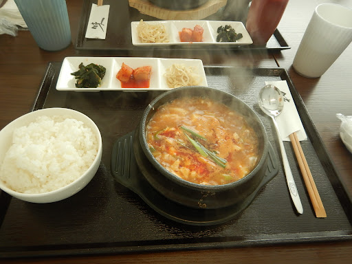 メインと3種のつけあわせ、ご飯。 スンドゥブの具は豆腐、玉子、ネギ、ニラ等々 アサリが2個、豚肉は無し。 肉は入ってて欲しかった。 アサリももう少し入ってて欲しかった。 スープが、何と言えばいいのか、少し独特な味する。とりあえずご飯にぶっかけ、食す。