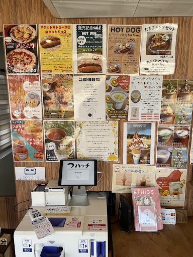 Mini café do Green Park em Tsu. Os pedidos são feitos através de um painel touch e o pagamento pode ser feito com cartão e alguns apps, além de dinheiro. Diferente da maioria dos lugares que vendem as coisas bem caro pela falta de concorrência e deixam a qualidade cair no chão, posso dizer que aqui o preço é válido. Tudo muito bom e rápido, mesmo com muita gente saindo e entrando. Lugar bem organizado e limpo, apesar de pequeno. É válido...