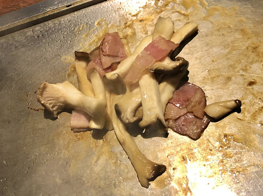 注文は席に置いてあるQRコードをスマホに読み込んで行います テーブルの真ん中には細長い鉄板が横たわっていて、そこでお好み焼きなどを焼いたりチャーハンなどを温めておけます でも、刺身盛りなどは鉄板のあちらからこちらへ橋を渡す形の器で、火からは少し離すことができるようになっています (今回は注文しませんでしたが)