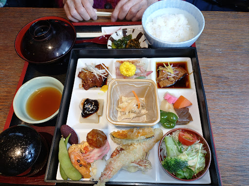 料理は「四季折々の一つの空間に盛り込んだ料理長渾身の作」と銘打ついろどり御膳を注文。内容は松花堂弁当風の物ですが、箱の中はプレートスタイルになっています。 季節によって内容は変わるとのことですが、天ぷら、煮物、煮魚、角煮等でお造りがカルパッチョになっているのが珍しい所。プレートの中で料理同士が混ざらない様に盛り付けされていました。個々の料理は美味しかったです。特に天ぷら、煮魚、角煮とお造りのカルパッチョが良かったです。他に、ご飯と味噌汁と茶碗蒸しが付いて、食後には飲み物とアイスクリームも付いてきました。内容の割にお値段も1800円で高くないと思います。他にもっとお値打ちな料理も多数あります。