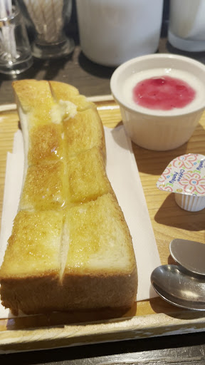 人気の「モーニング¥530」は、トーストと2つのサブが選べてドリンクメニューも豊富です。本日はバターに小倉餡とヨーグルトをチョイス。東海のthe朝ごパンって感じですね。厚切りトーストに染み込むバターがウマーっです!さらに小倉餡を乗せて名古屋風に。小豆の甘味が良き。ヨーグルトも酸味が少なく食べやすい。炭焼ブレンドコーヒーも香り高く芳醇で朝からのんびり時間が過ごせますね。