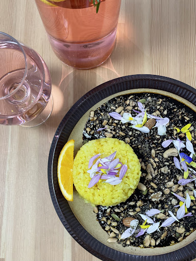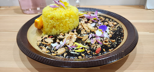 真っ黒な中に花びらが散らされた、 見た目も美しいブラックカリー。𓈉 アーモンドやカシューナッツなどいろんな種類の ナッツがごろごろと入っていて 食感もたのしい。𓎩 ピリリと、でも後を引かない辛さがあるのに 甘さも隠れた不思議なお味。 他では味わえない、だけどとっても美味しい ブラックカリー。𓌉◯𓇋❤︎ ターメリックライスにオレンジをかけると また違った味わいに。𓂑 𓌈 実は筆者も移転前からこのカリーのファンで 久しぶりに食べたけど、すぐにまた食べたく なっている自分がいるくらいクセになる。𓎡