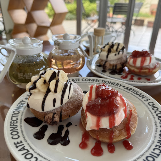 カフェ限定メニューの生ドーナツは、カスタードいちご添えとチョコレートばなな添えの2種類✌️ もりもりにデコレーションされた生ドーナツは可愛過ぎます♥️ 終始、何回も可愛い〜を連呼しちゃった笑笑😛