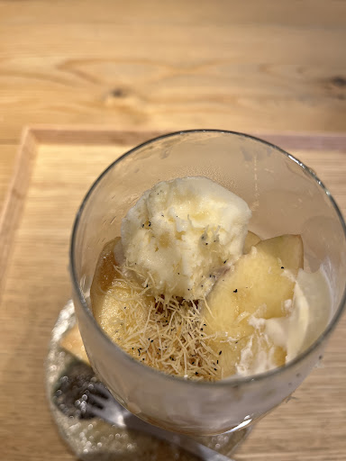 バニラアイス、アールグレイのアイス(めちゃうまい)ブランマンジェ、桃ゼリー 他にカサカサした食材も入っていて、カダイフという小麦粉で作られたものらしいです。 パティシエさんすごーい…と思ってしまいました。食感が何とも言えない軽い感じで、食べ飽きないよう工夫されてます。