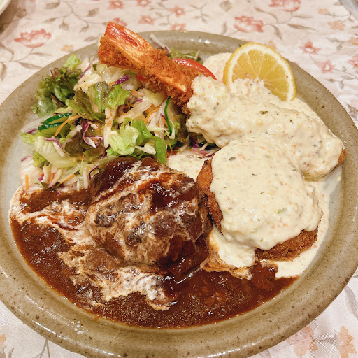 メニューはハンバーグやオムライス、ドリアやクリームコロッケなど洋食屋さんらしいものから、お刺身の定食などかなり幅広く迷ってしまいました笑 今回は「ハンバーグとクリームコロッケ」と「とんとろオムライス」にしました! 全部おいしかったのですが、とんとろオムライスは中に豚肉の角煮が散りばめられていて最高でした! 食後に本日のケーキ(かぼちゃのチーズケーキ)をいただきましたが、こちらも優しいお味でgood♪