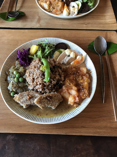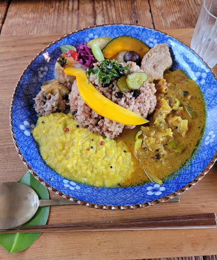 お昼ごはんは、一択のよう… お野菜たっぷりスリランカレー(トッピングの生でいただくコリンキー🎃、おいし♥)と、 お豆のカレーのあいがけ と、いろんなおかずを添えた 酵素玄米のカレーのプレート と、 デザート(ココナツミルクの紅茶プリン、抹茶味のビーガンアイス、オーガニック🍌) の、 セットで、💴1,650 とってもからだに良さげなお昼ごはんです。 とっても、ヘルシーです⭕