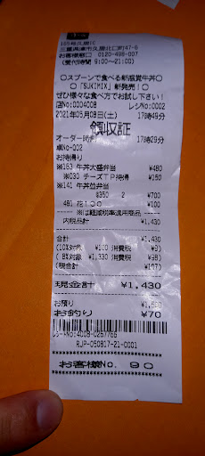 Read more本日、午前中にお邪魔しました。 何気にレジカウンター内に目をやると、売上げ伝票が貼り付けてありました。 よくよく目を凝らしてみると、ピンクのペンで“くいにげ”の文字。 居るんですね…すき家さんみたいな安価な店で食い逃げする人。 また、その伝票をめざとく見つけてしまう私。 その伝票のお会計は並牛丼・ネギ玉追加で580円也。 伝票№54 卓番A6…私が№80 ...